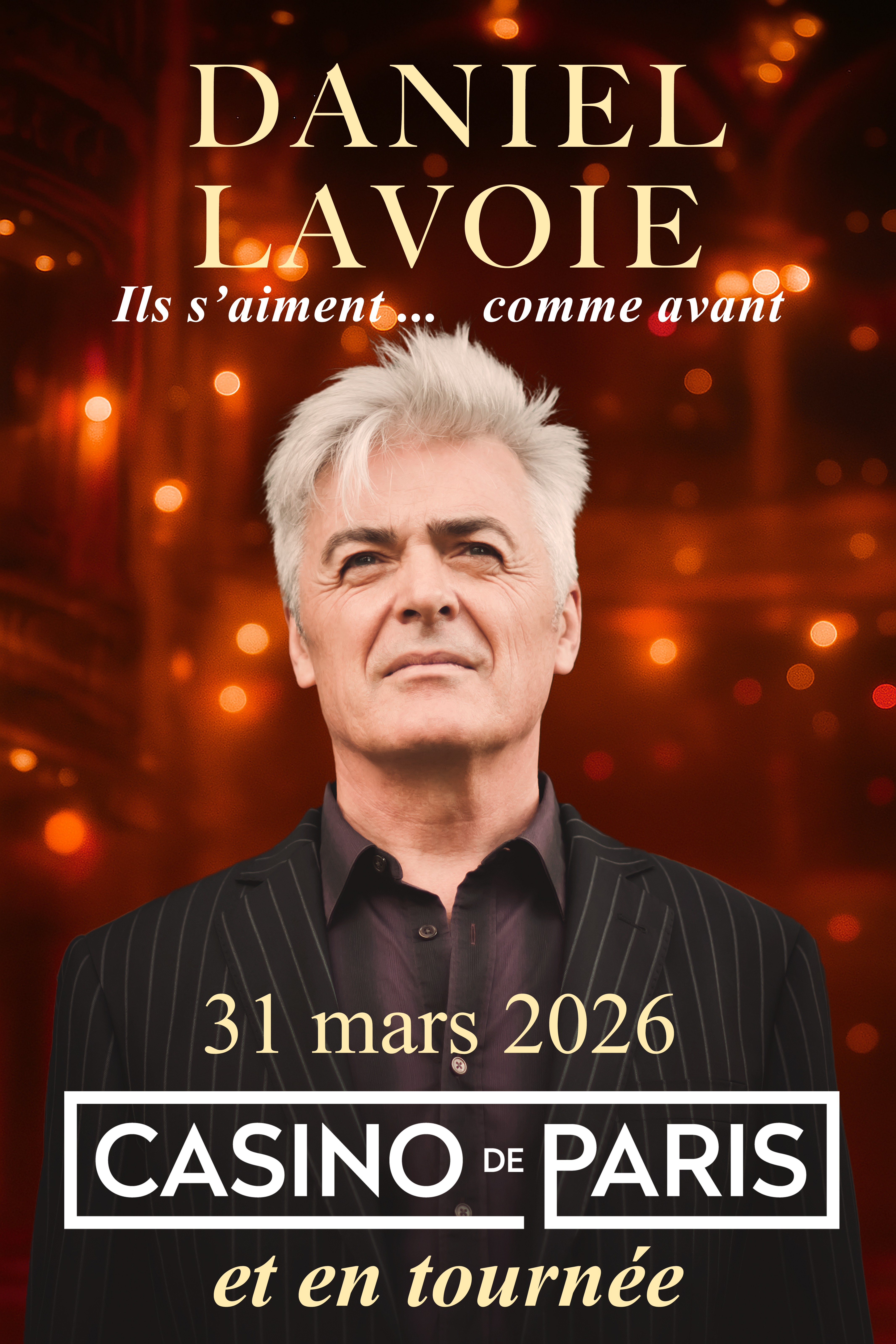 Après une tournée québécoise Tension attention - 40 ans très réussie, Daniel Lavoie présentera enfin ce spectacle en France sous le nom Ils s'aiment...comme avant ! Accompagné de ses fidèles musiciens, il sera au Casino de Paris le 31 mars 2026, et passera également par Lyon, Bordeaux, Lille, Nantes et plusieurs autres villes. Ne manquez pas ce spectacle intime et chaleureux, présenté pour la première fois en Europe au mois de mars prochain.